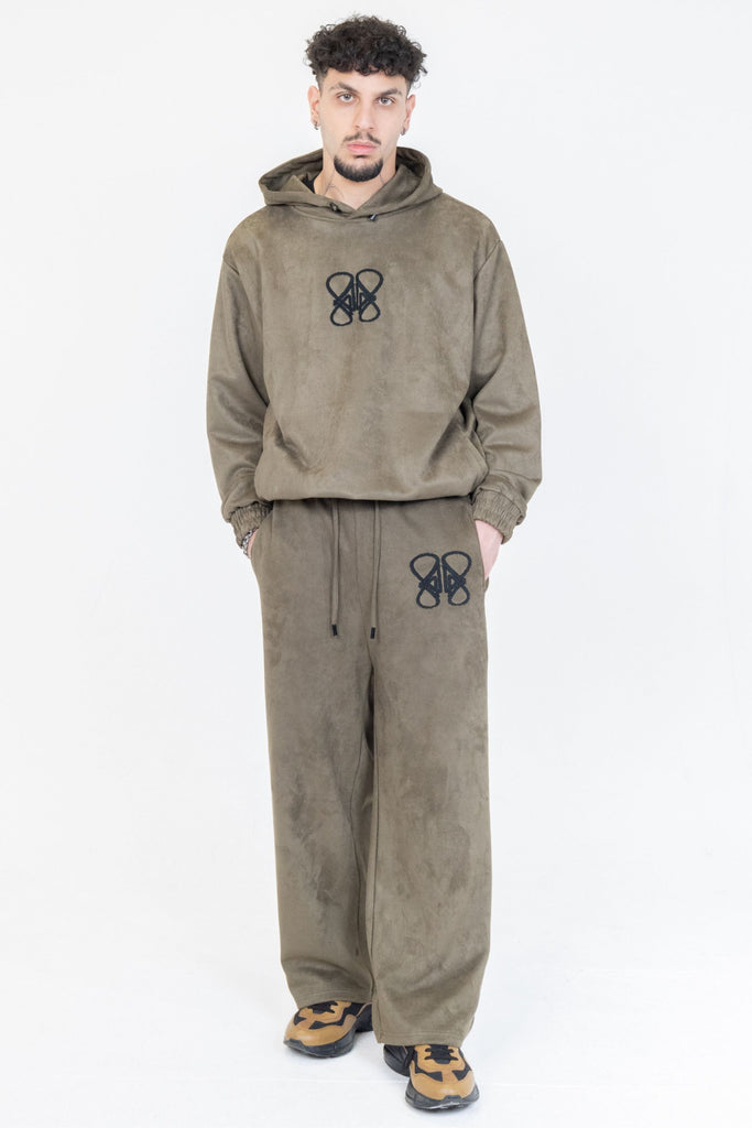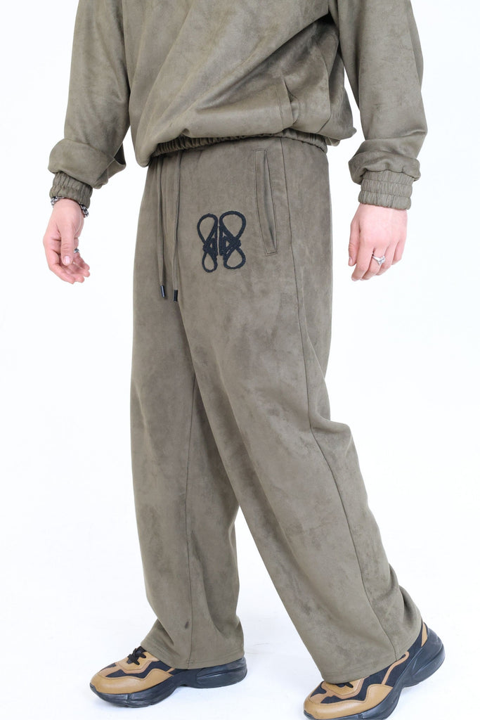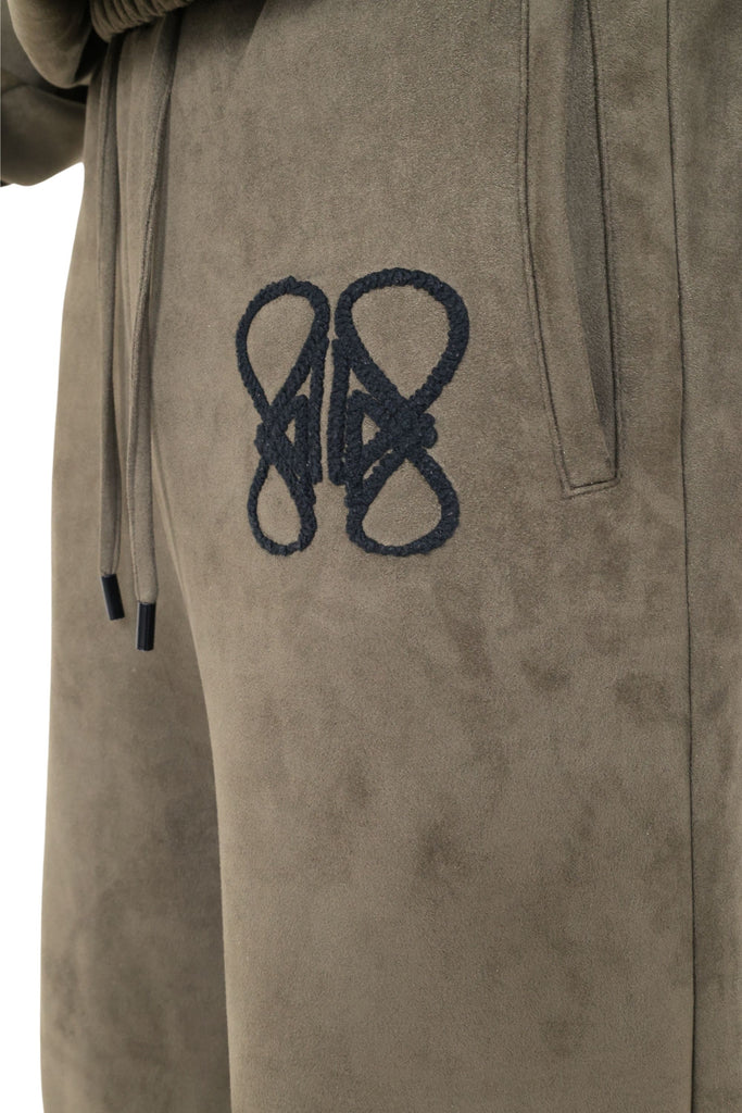 Oversize comfortable fit - Soft Highest Quality Vegan Suede - Deep individual side pockets - Metal tip drawstring - Elastic waistband - Elastic cuffs - Front left leg embroidery - Back pocket embroidery detail-