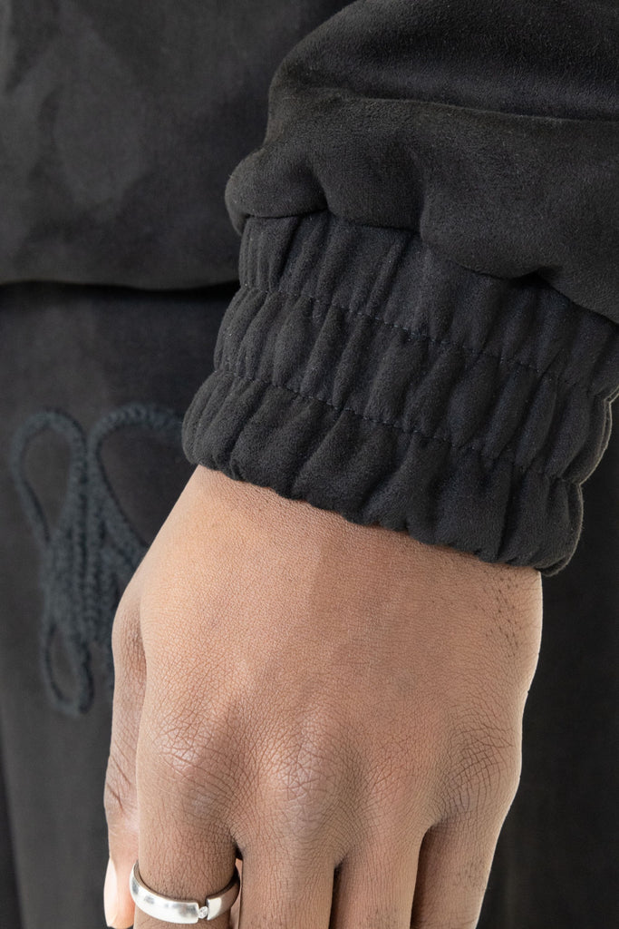 True to Size -Oversize comfortable fit -Black Coton fur Connection Logo- Hidden Metal tip Drawstring - Suede Ribbed cuffs - Individual side pockets- Soft touch Deep Vegan Suede