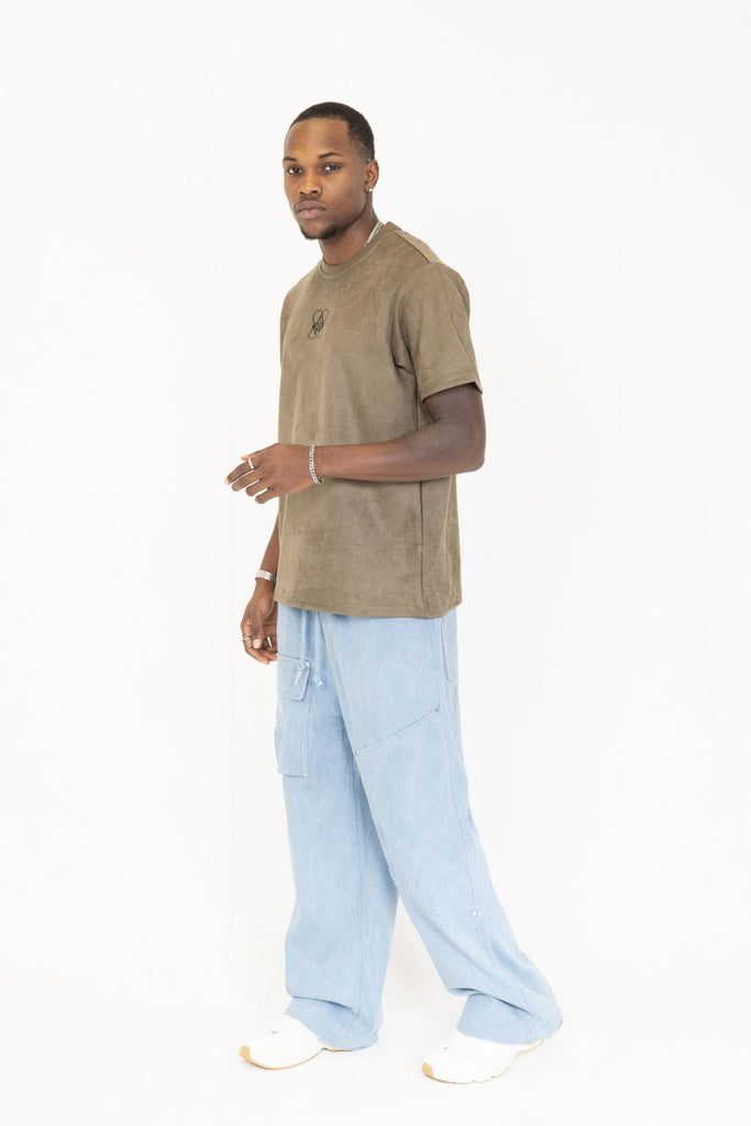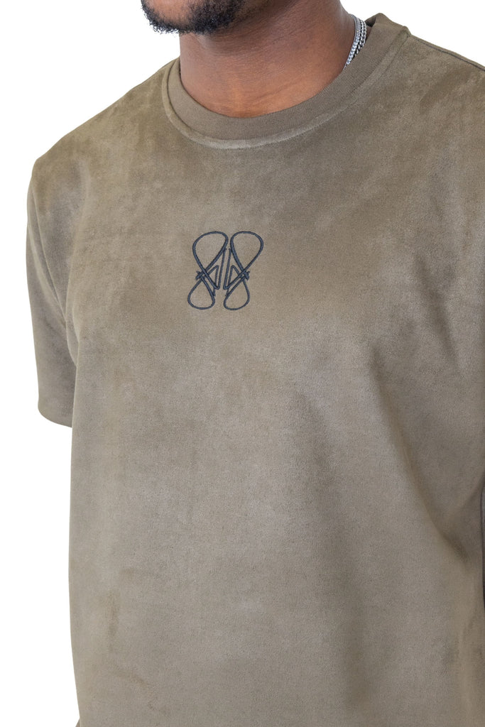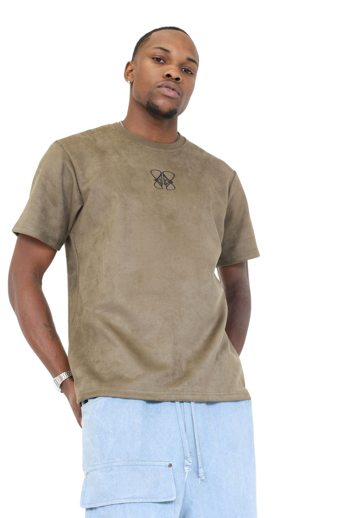 The KHAKI SUEDE T from Alexandar Lovure. Created from a special blend to create a luxury vegan suede t with a unique deep soft texture highlighted by a black embroidered connect logo on the front of the T finished by our signature rear neck embroidery