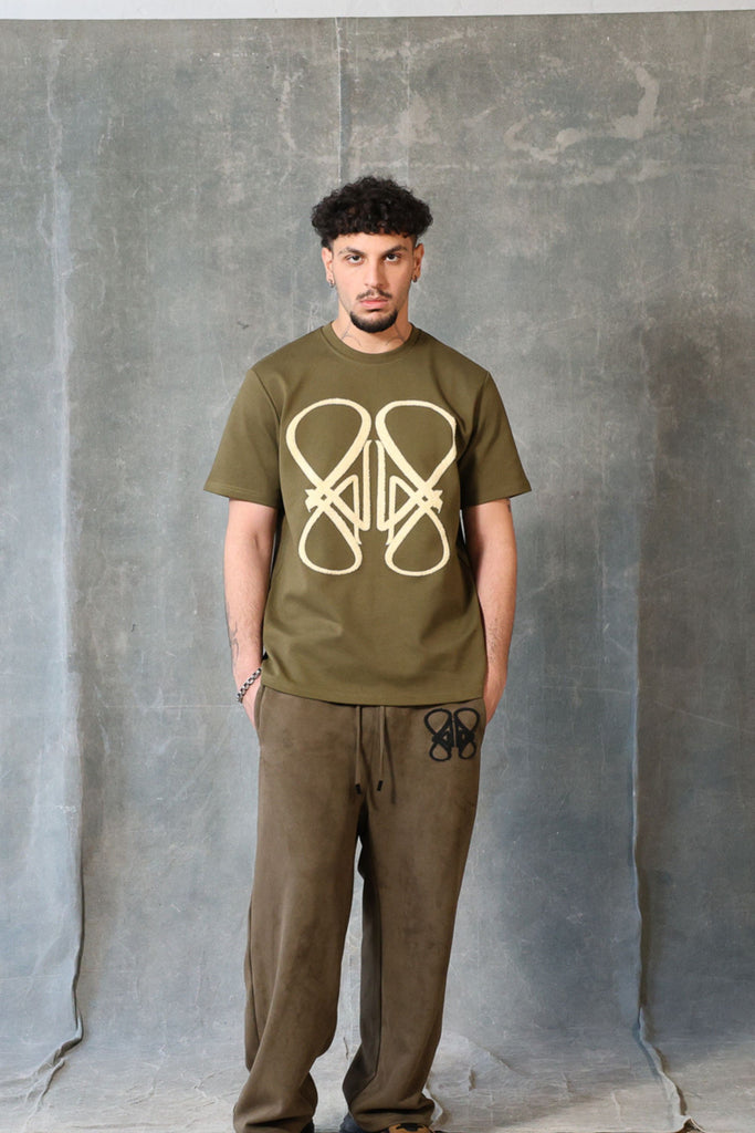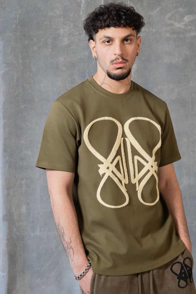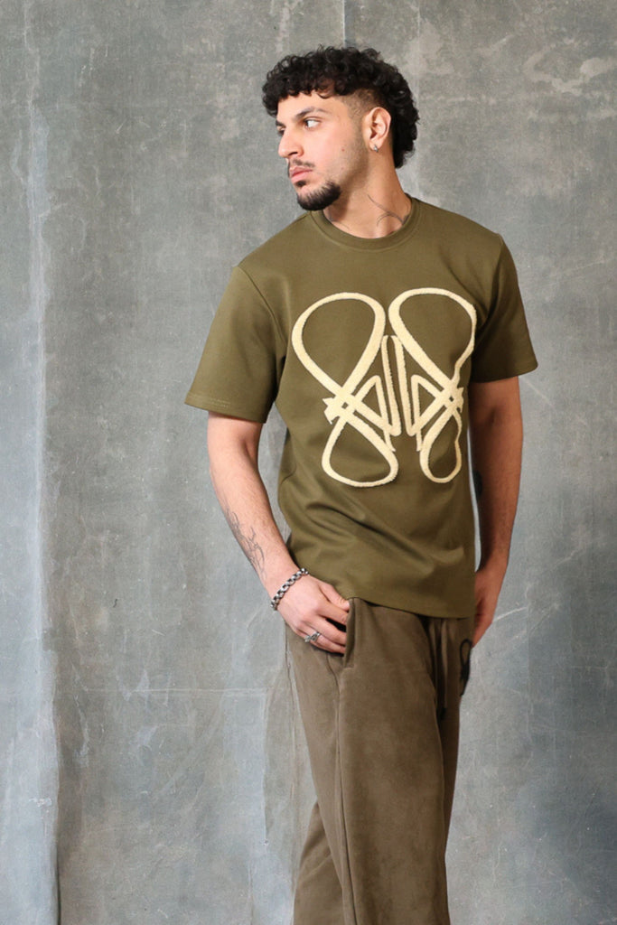 The GREEN ZIGO T from Alexandar Lovure. Created from a special blend of cotton and poly to create a luxury heavy t with a unique texture highlighted by a large cream fur connect logo on the front of the T finished by our signature rear neck embroidery